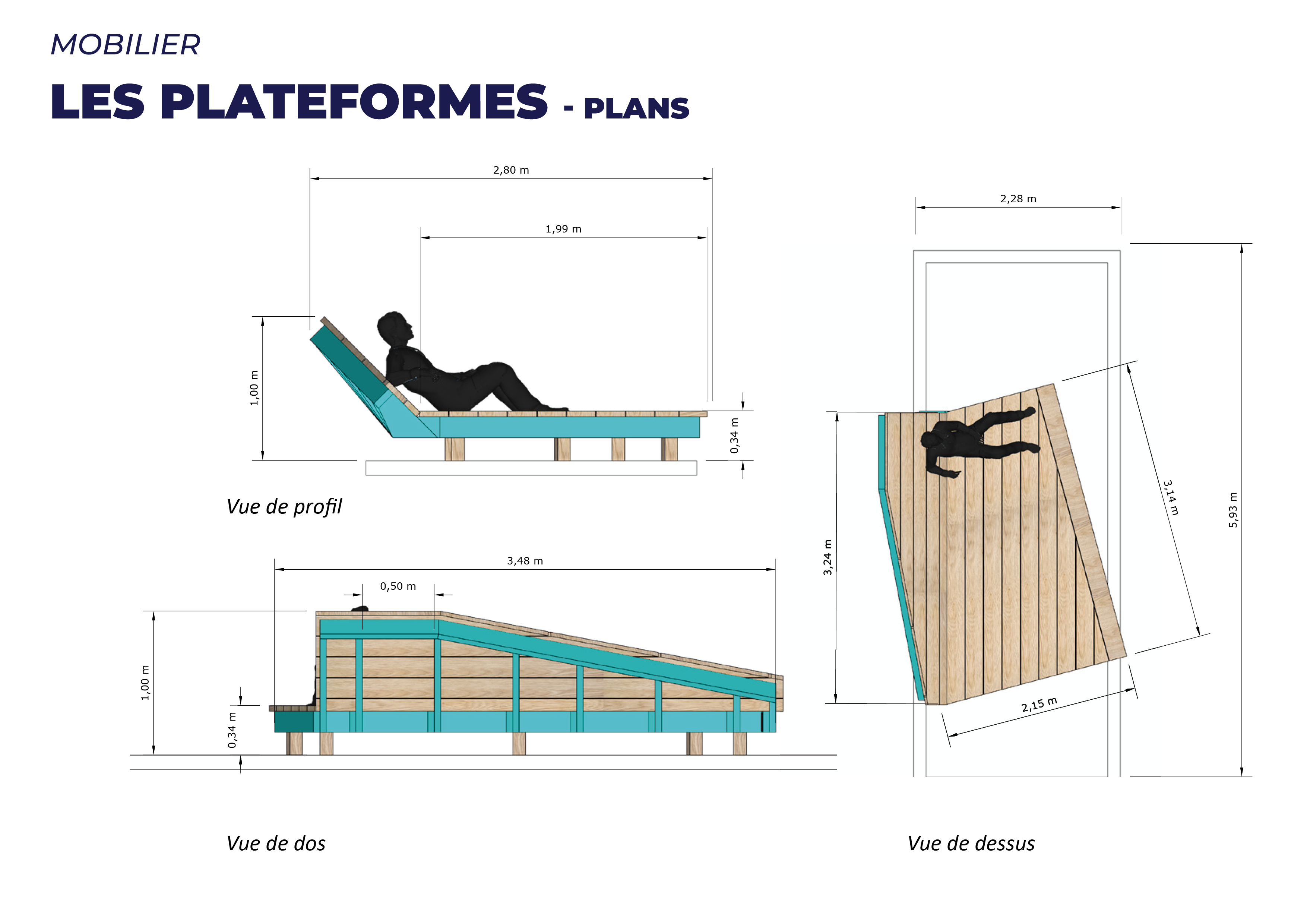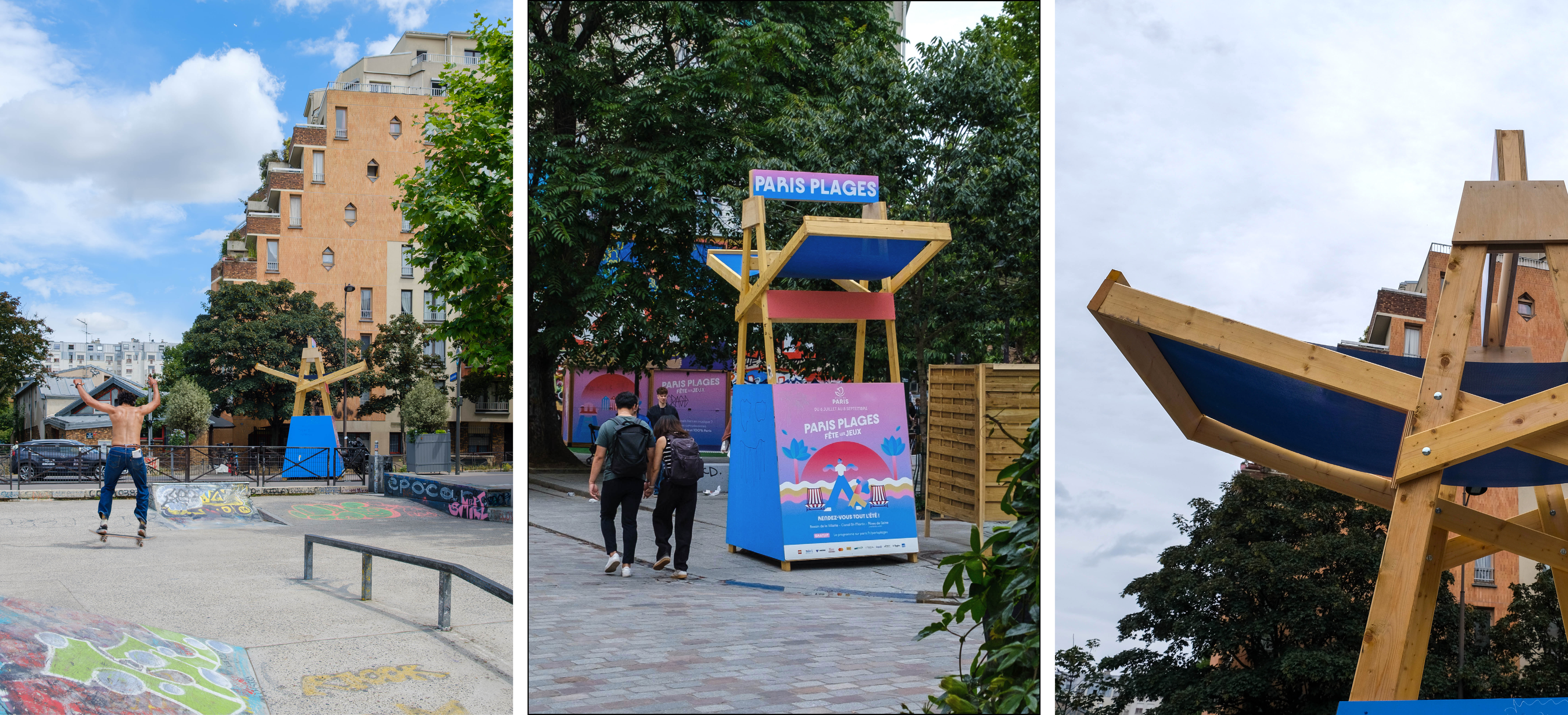 L’ensemble du mobilier spécifique et sur mesure est réalisé par la régie de la Ville de Paris. Il est conçu pour s’adapter au mobilier urbain existant — bordures, plots en granit, poutres en acier — afin de s’implanter facilement et durablement sur les différents sites de Paris Plages.