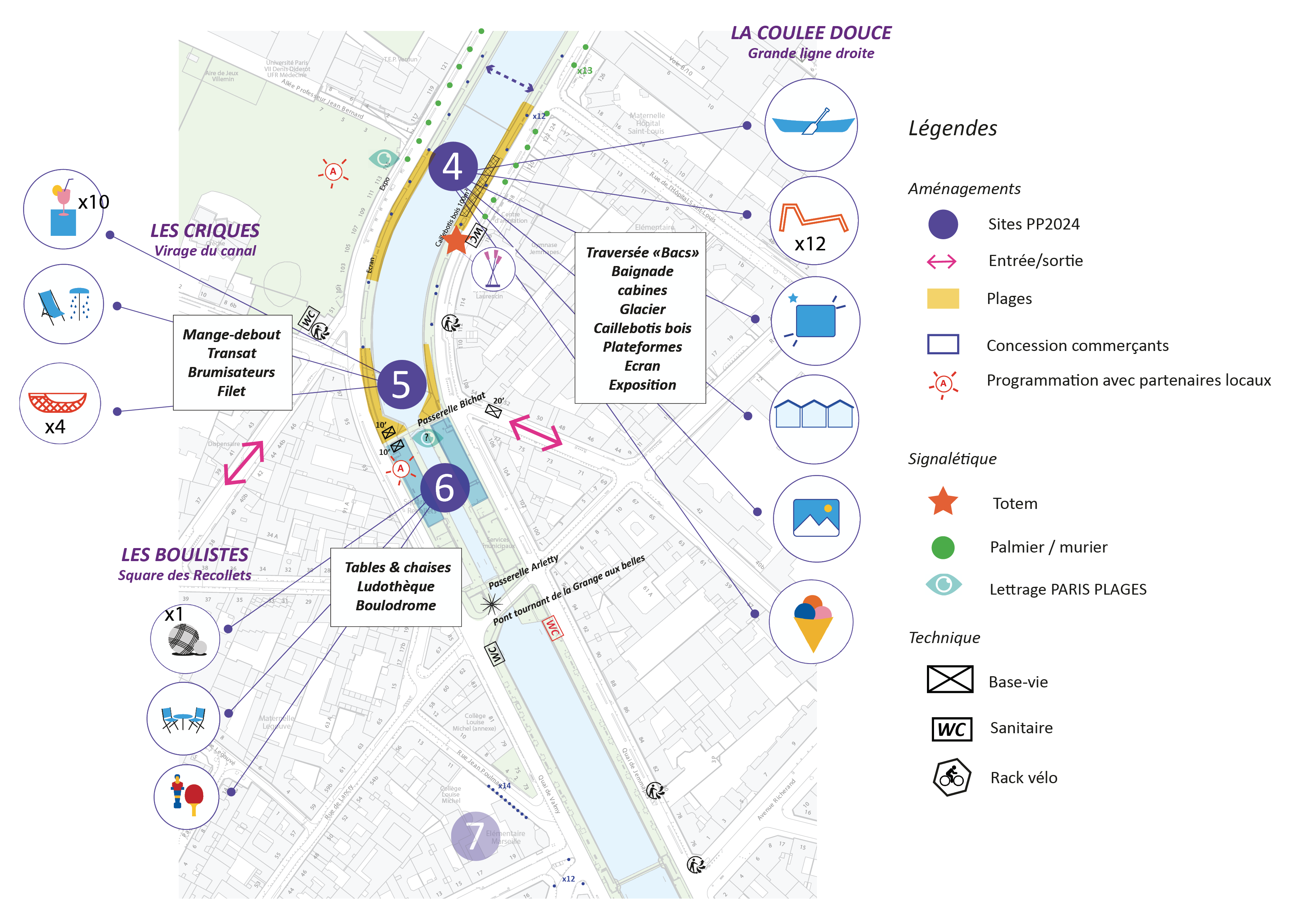 En 2024, Paris Plages s’enrichit d’un nouveau site : le Canal Saint-Martin, inauguré à l’occasion de cette édition. La scénographie propose une lecture transversale des trois sites emblématiques de Paris Plages :