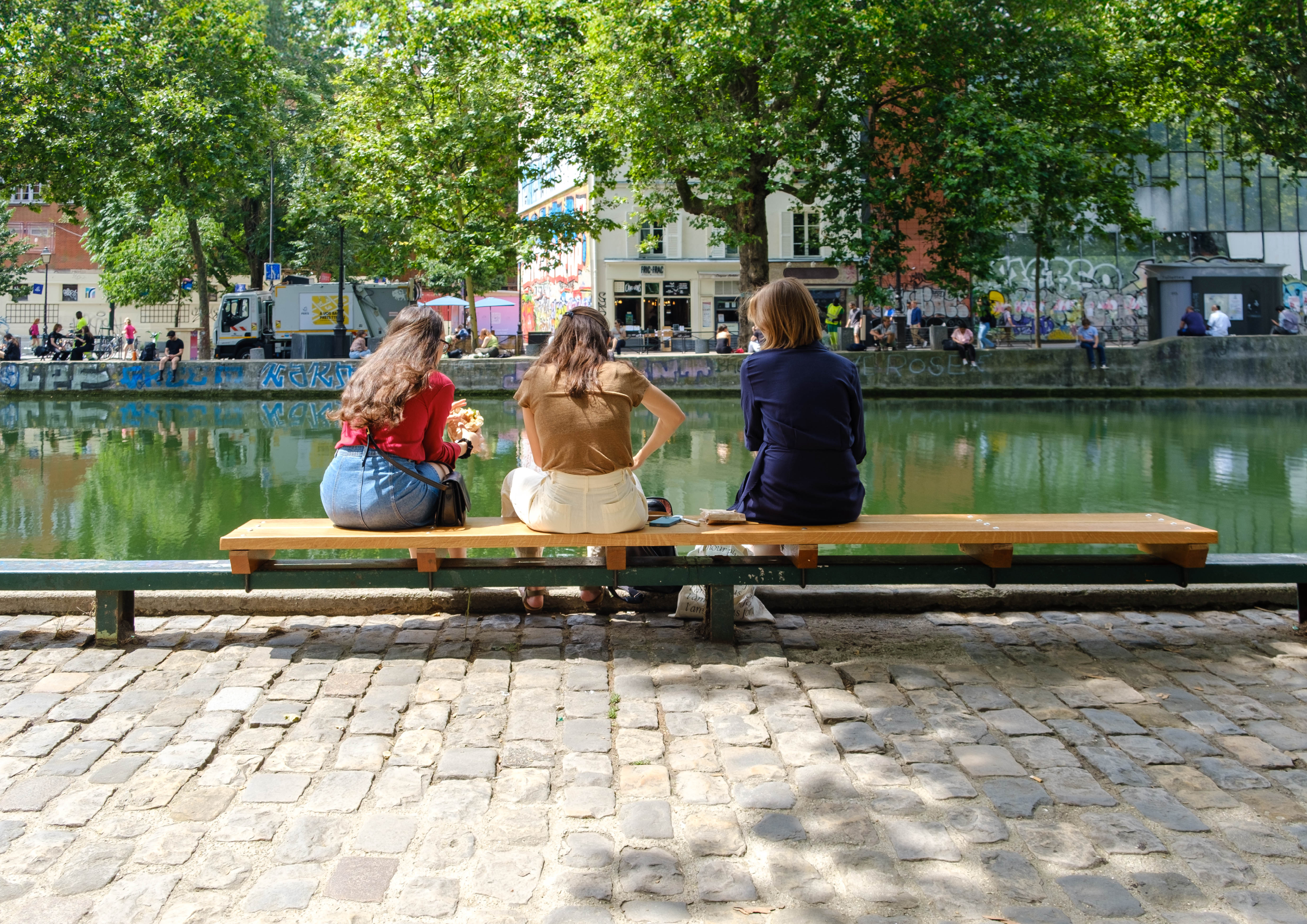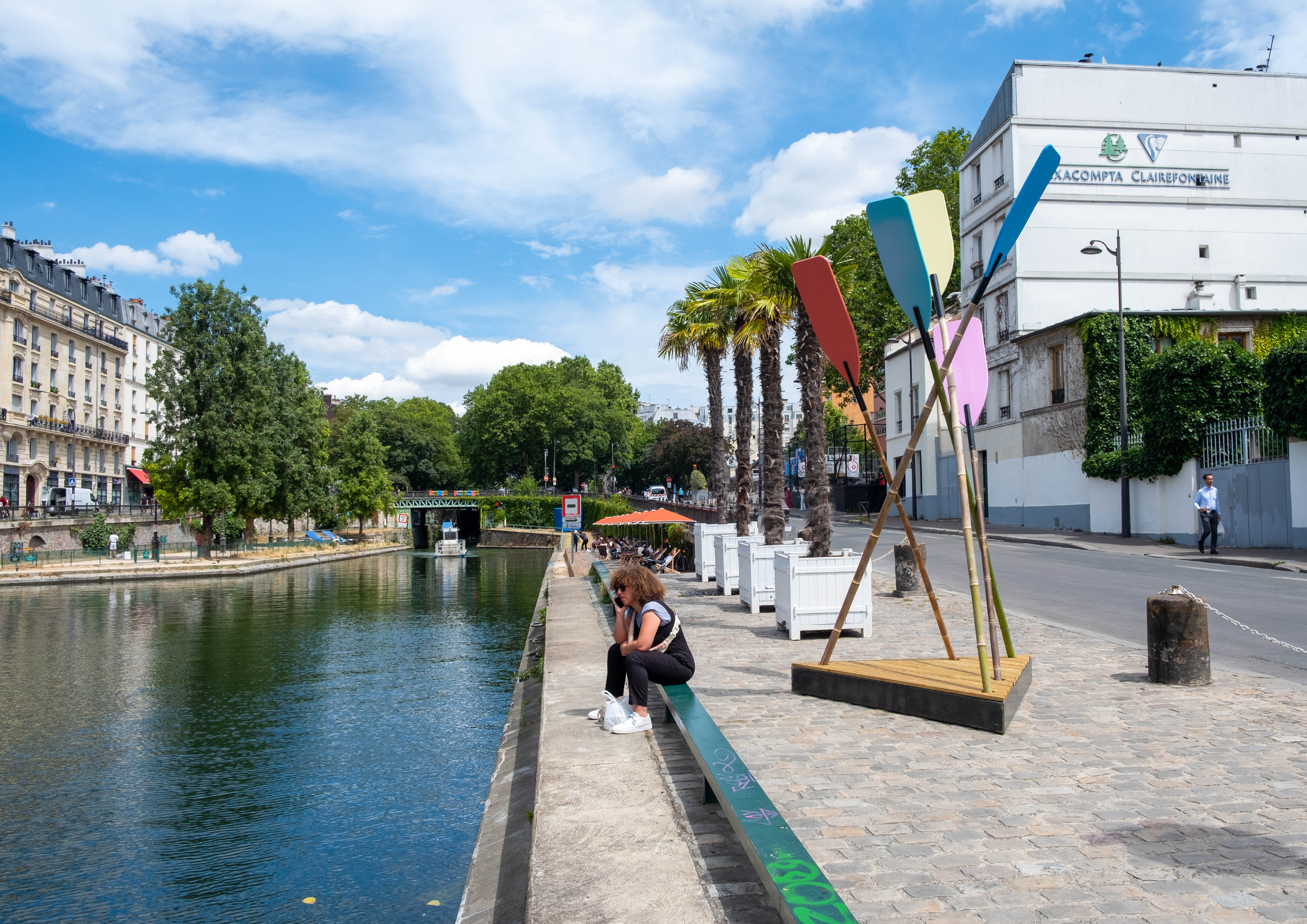 Les cafés et boutiques du quartier, prolongés par des terrasses au bord de l’eau, invitent à la pause : lire, profiter du soleil, travailler, ou encore participer à des activités sportives et culturelles. Les façades environnantes témoignent de l’héritage historique du quartier, rappelant l’époque où le canal constituait un centre névralgique de l’activité industrielle parisienne.