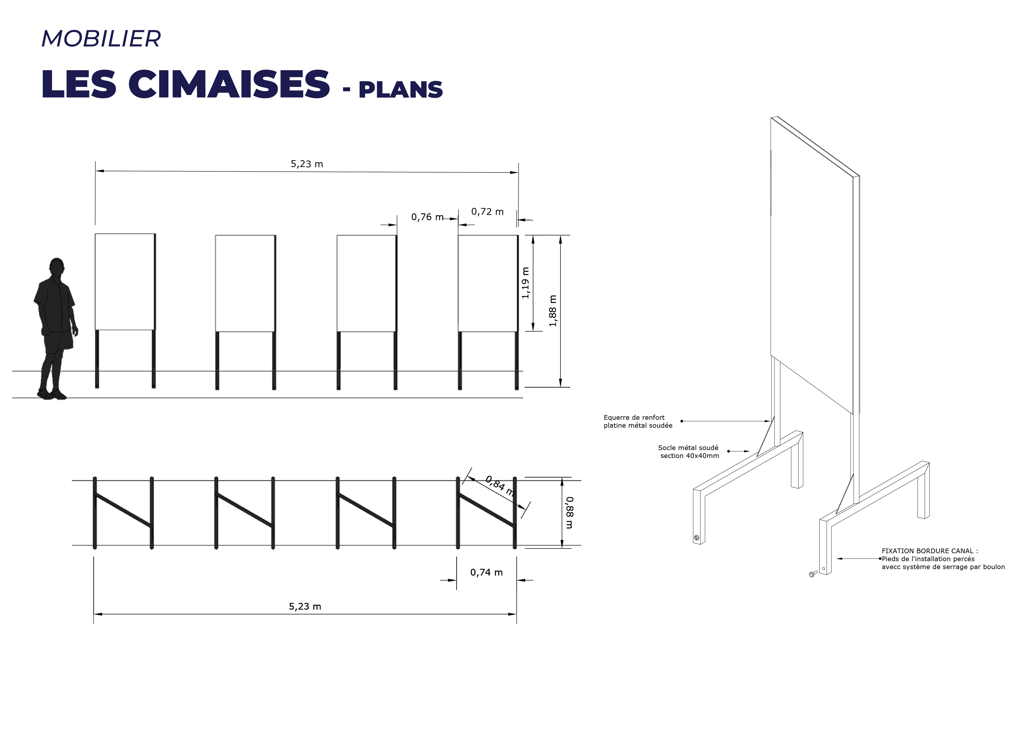 Cimaise d’exposition fabriquée en cadre acier peint avec des panneaux en dibond ou bois R/V.