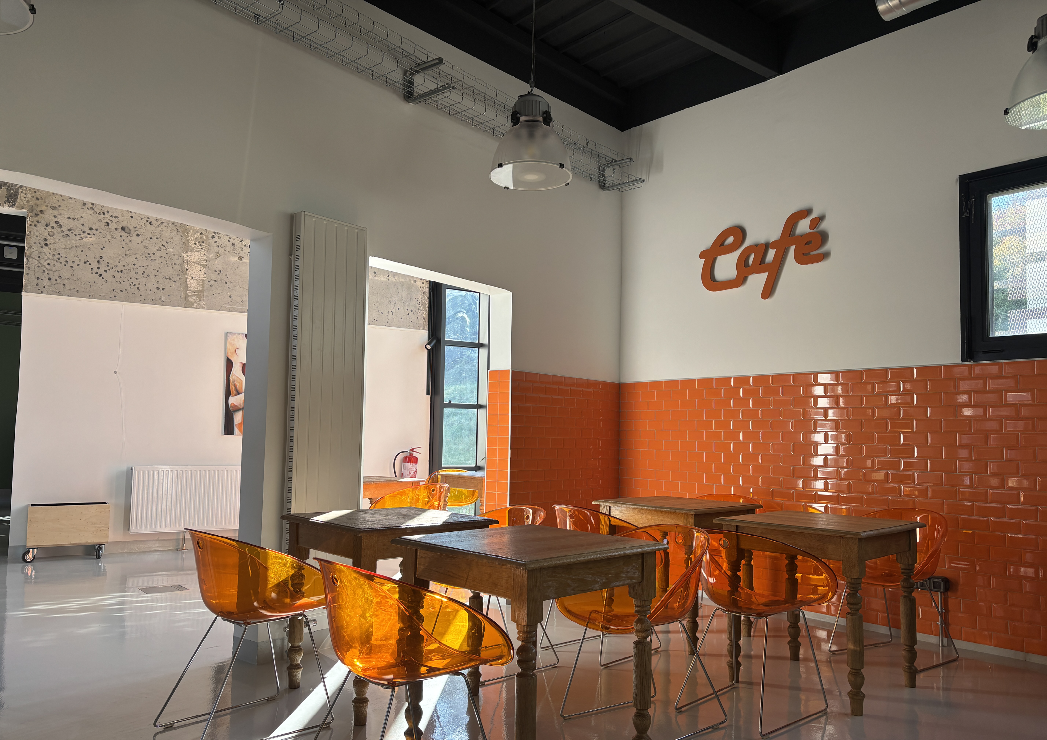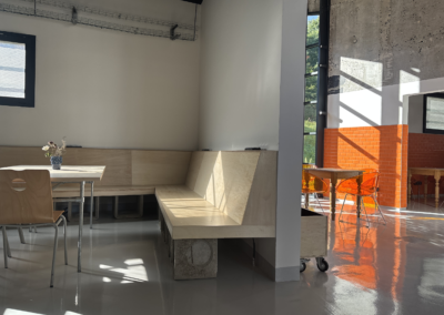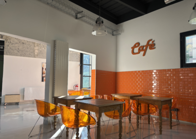 Les aménagements intérieurs sont dessinés et choisis pour leurs usages, tout en valorisant une palette de matériaux bruts et durables qui dialoguent entre eux et confèrent une identité forte et cohérente aux différents espaces. La signalétique, pensée comme un élément à part entière du projet, accompagne et guide les visiteurs dans la découverte de l’ensemble des programmes du tiers-lieu.