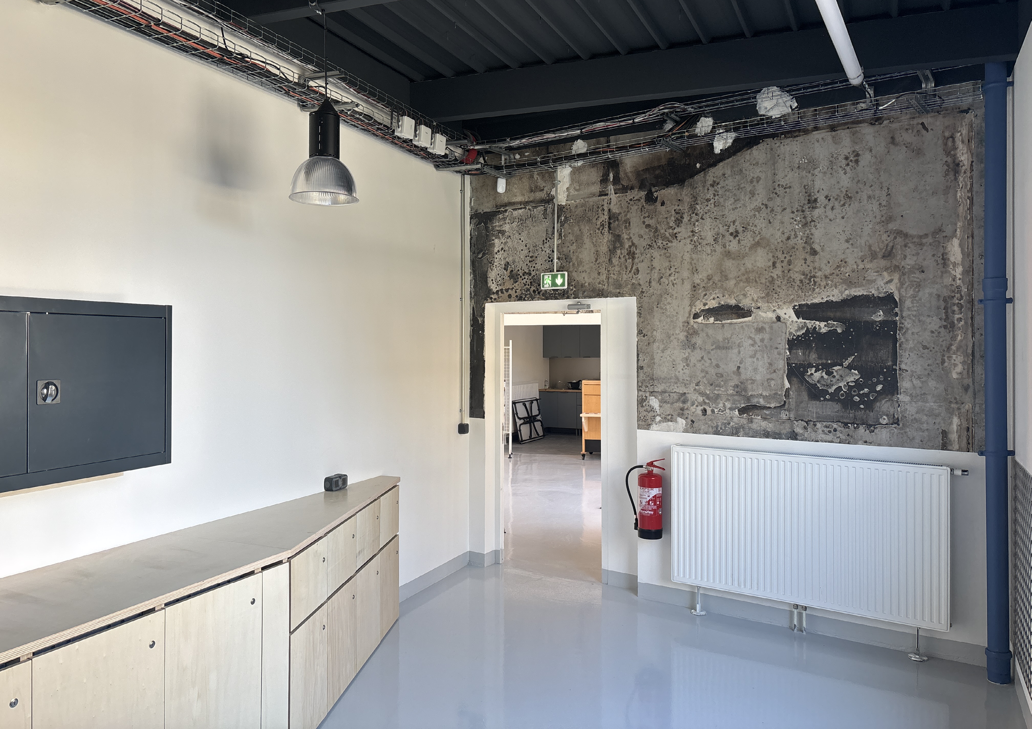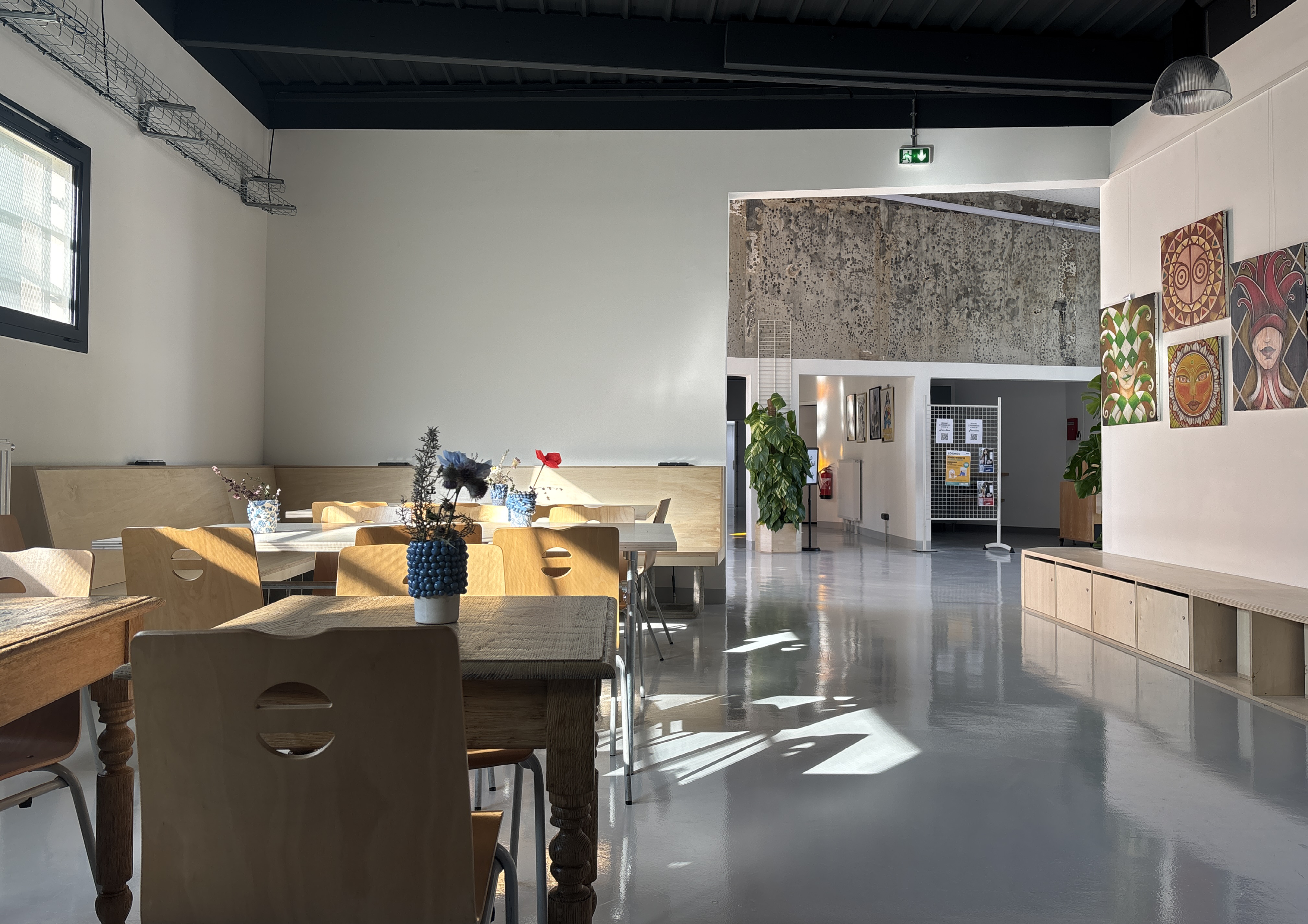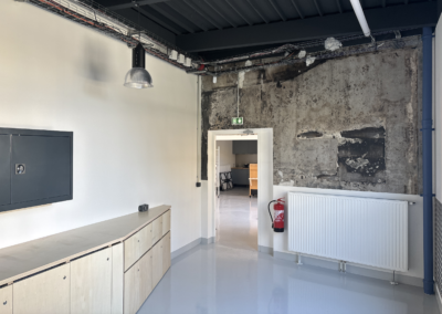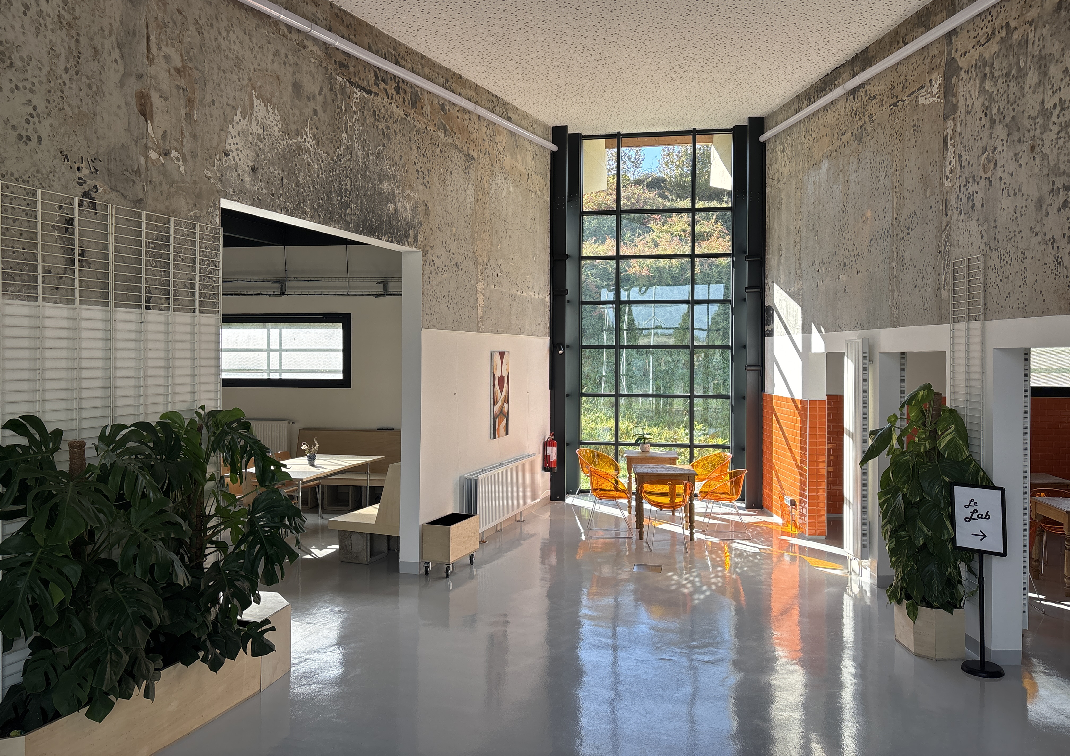 Le parti pris du projet repose sur la conservation volontaire de certains aspects bruts du bâtiment afin de révéler et raconter les différentes histoires du lieu : dalle en béton, murs en béton apparent, plafonds techniques laissés visibles. Ces éléments constituent une trame existante assumée, servant de support à l’identité architecturale du tiers-lieu.