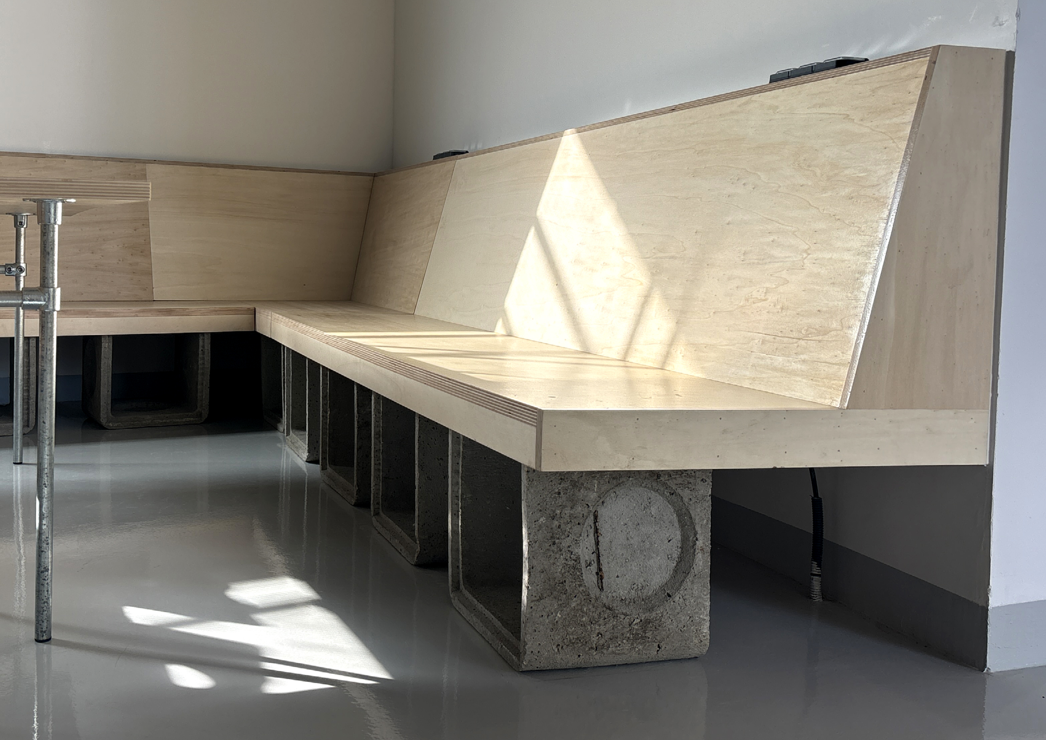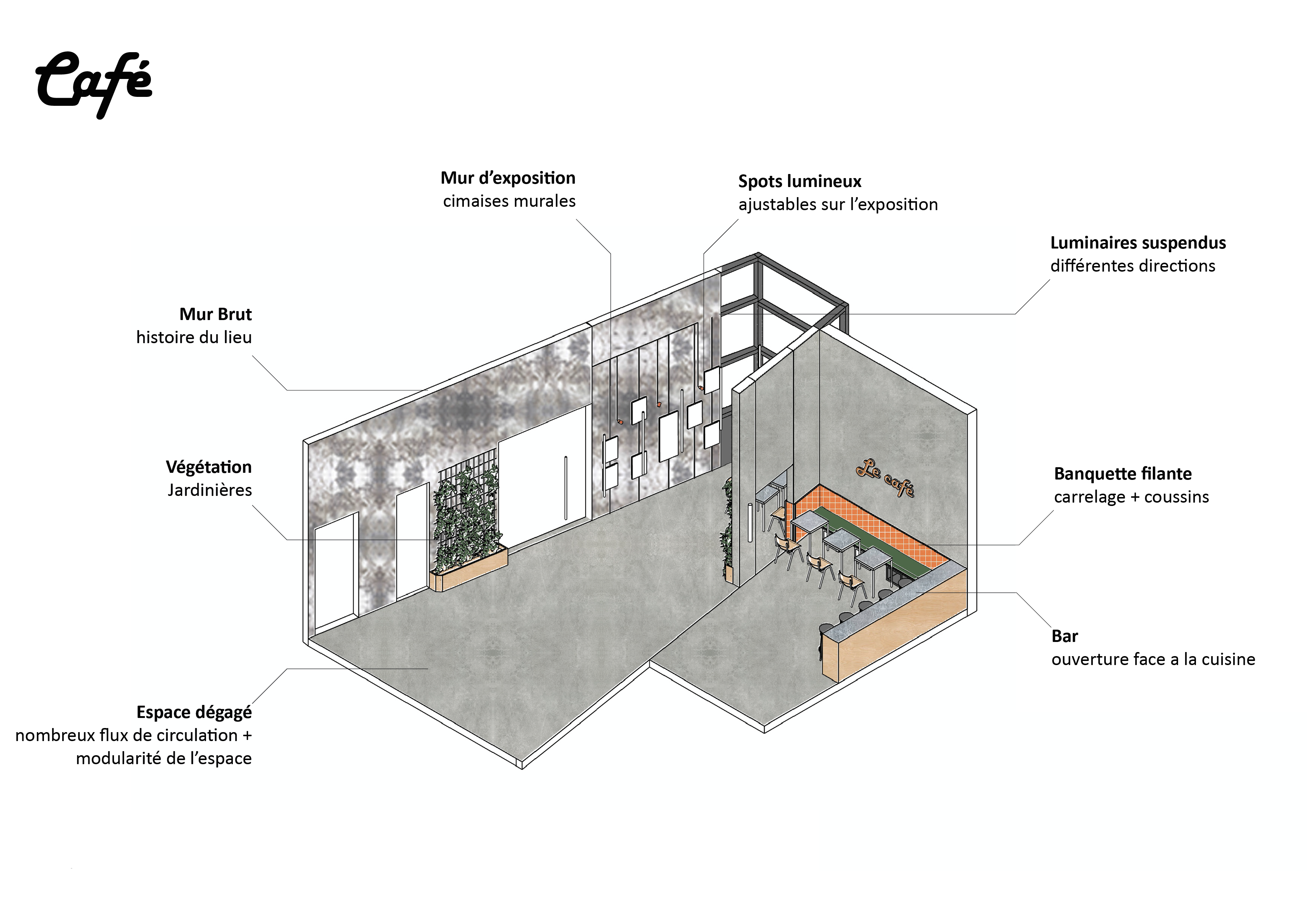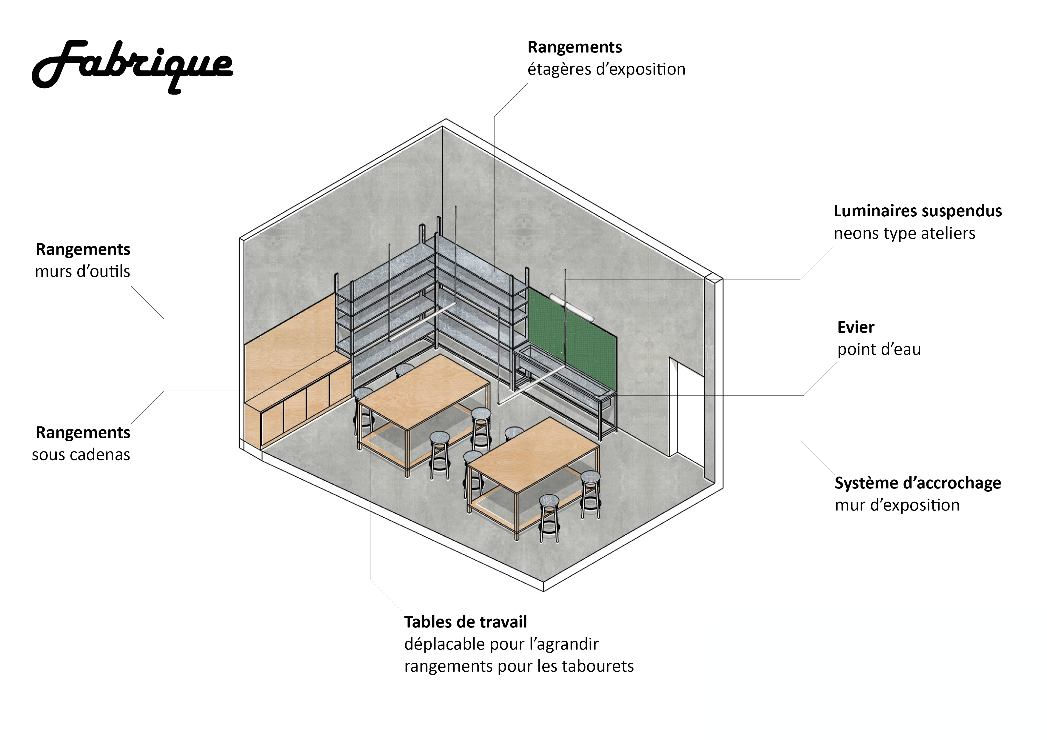 Le parti pris du projet repose sur la conservation volontaire de certains aspects bruts du bâtiment afin de révéler et raconter les différentes histoires du lieu : dalle en béton, murs en béton apparent, plafonds techniques laissés visibles. Ces éléments constituent une trame existante assumée, servant de support à l’identité architecturale du tiers-lieu.