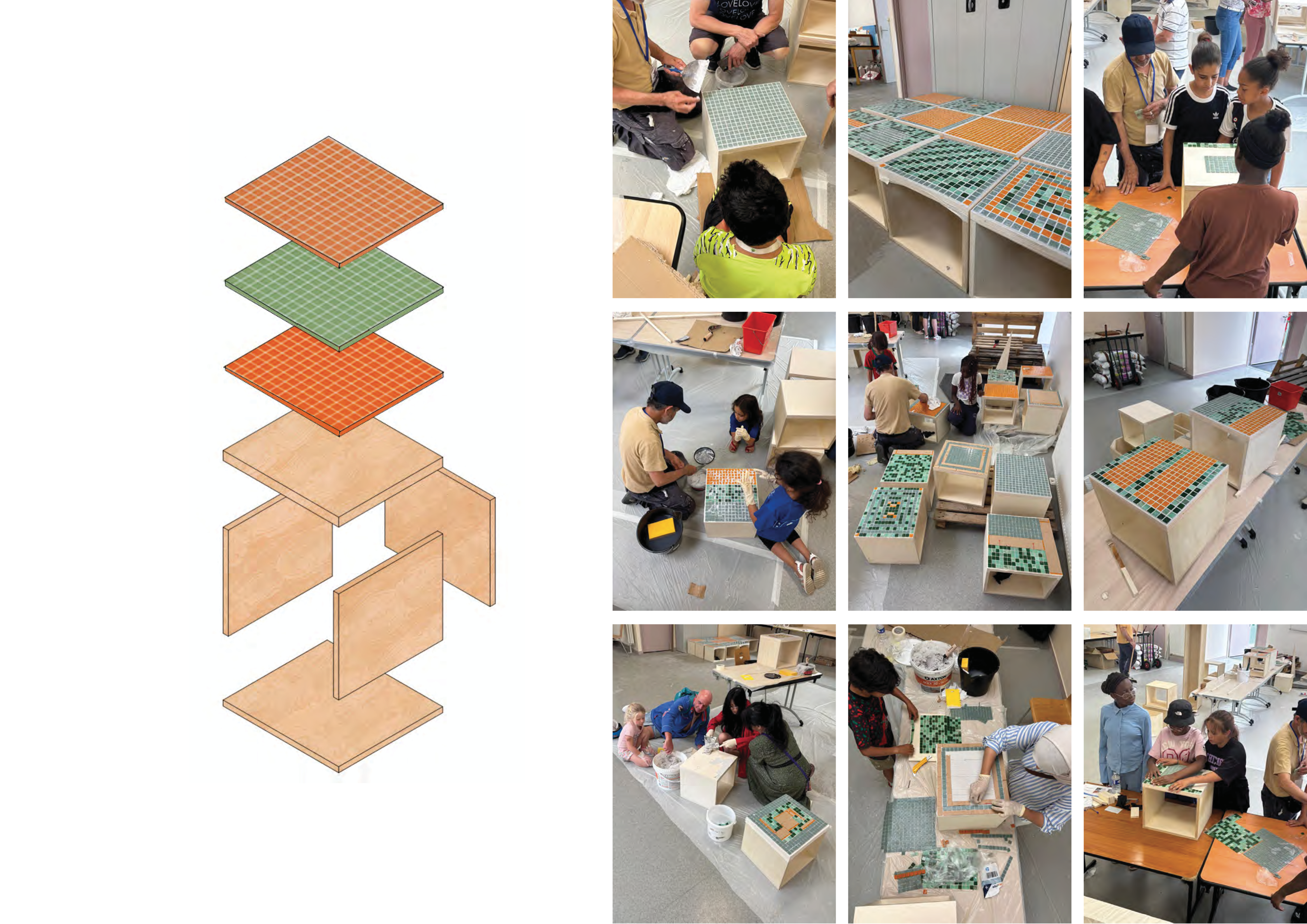 Au tiers-lieu Simone Signoret, un atelier participatif a été organisé autour de la fabrication et de la personnalisation de tables cubiques. Habitants du quartier et futurs usagers ont réalisé des plateaux en mosaïque colorée, donnant naissance à des tables basses uniques. Cet atelier intergénérationnel a permis d’impliquer les participants dans l’aménagement du lieu et de contribuer concrètement à son identité.