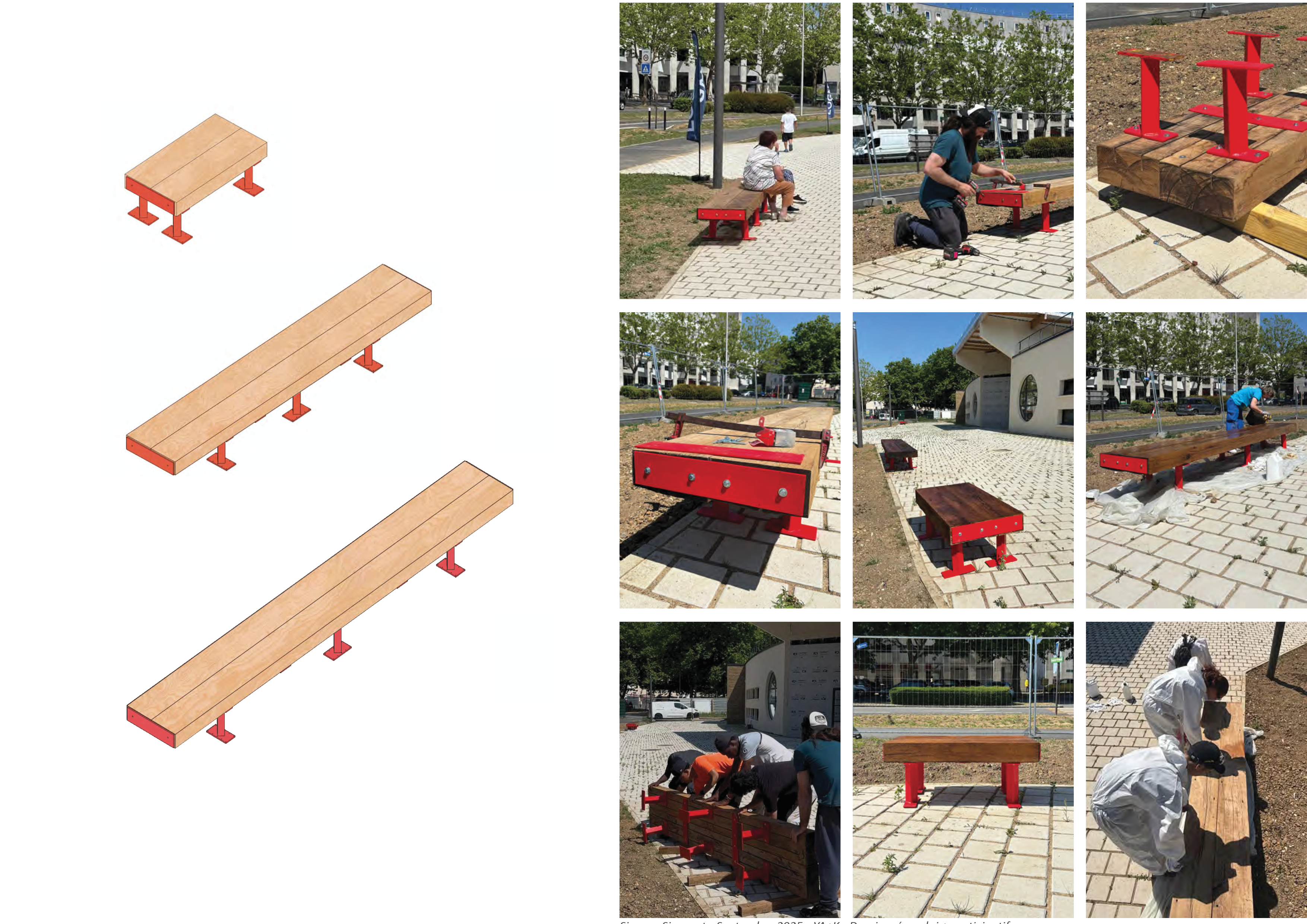Un chantier participatif de cinq jours a été mené avec des adolescents du quartier. L’atelier avait pour objectif la conception et la fabrication d’assises réalisées à partir de matériaux issus à 100 % du réemploi.